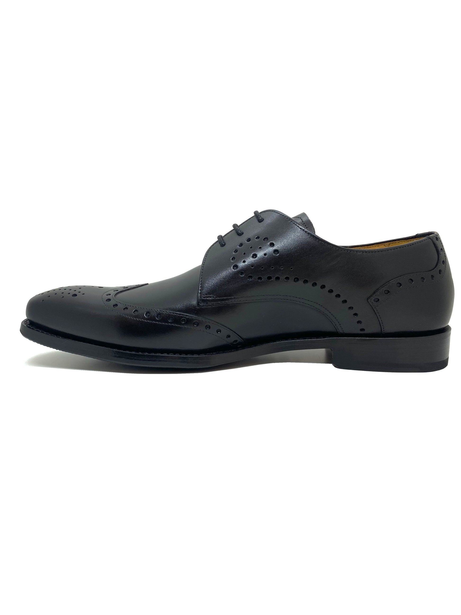 Introducing the George Wing Tip Brogue Derby, a distinguished masterpiece that encapsulates timeless elegance. This shoe pays homage to traditional craftsmanship with its intricate wing tip detailing and meticulously punched brogue patterns, techniques that originated in Scotland and Ireland as functional elements for draining water from shoes. George boasts a hand-brushed finish that emulates the exquisite grain of wood on its leather surface. Its upper leather undergoes a meticulous process, including a light base coat and a brush-applied darker stain, resulting in an antique wooden effect. The uppers are then wax polished to achieve a rich, deep patina. The shoe's classic design ensures that its form and structure endure even with prolonged wear. Its premium Italian leather sole, coupled with a rubber forepart, seamlessly merges durability with the elegant lines of a full leather sole.