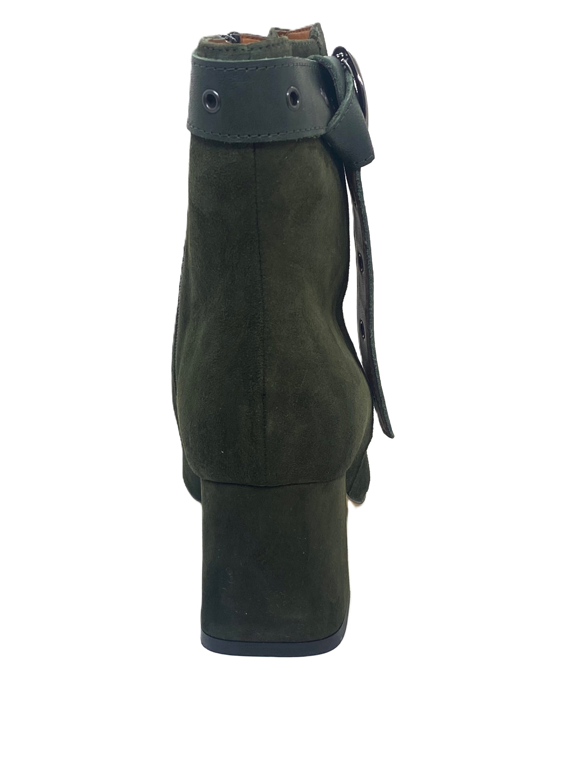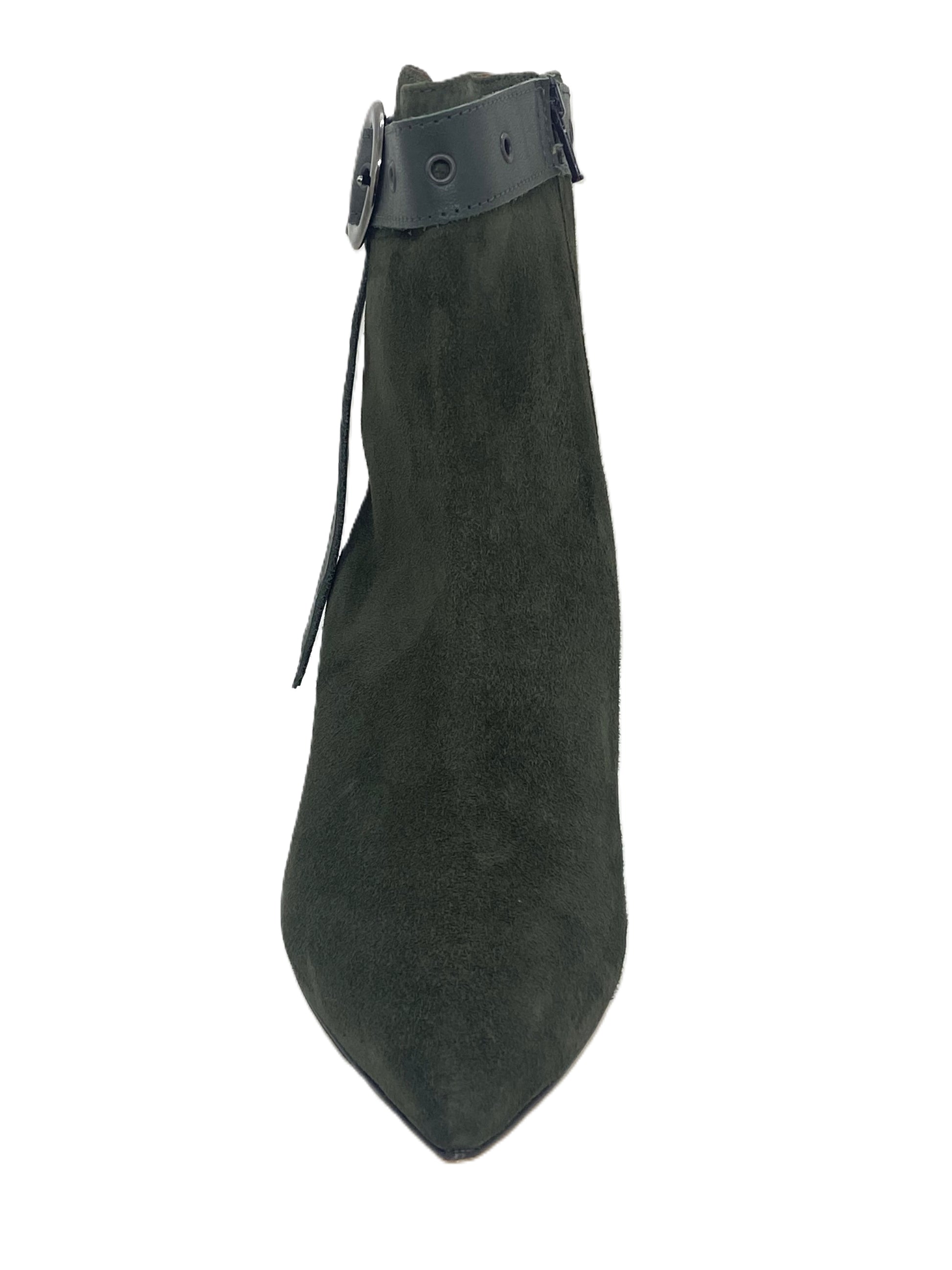 Stylish suede ankle boots with a pointed toe, on a mid height block heel. An oversized strap and buckle decorate the top and outer side of the boot. A zip to the instep allows easy foot access. The block heel gives a little extra height without instability.