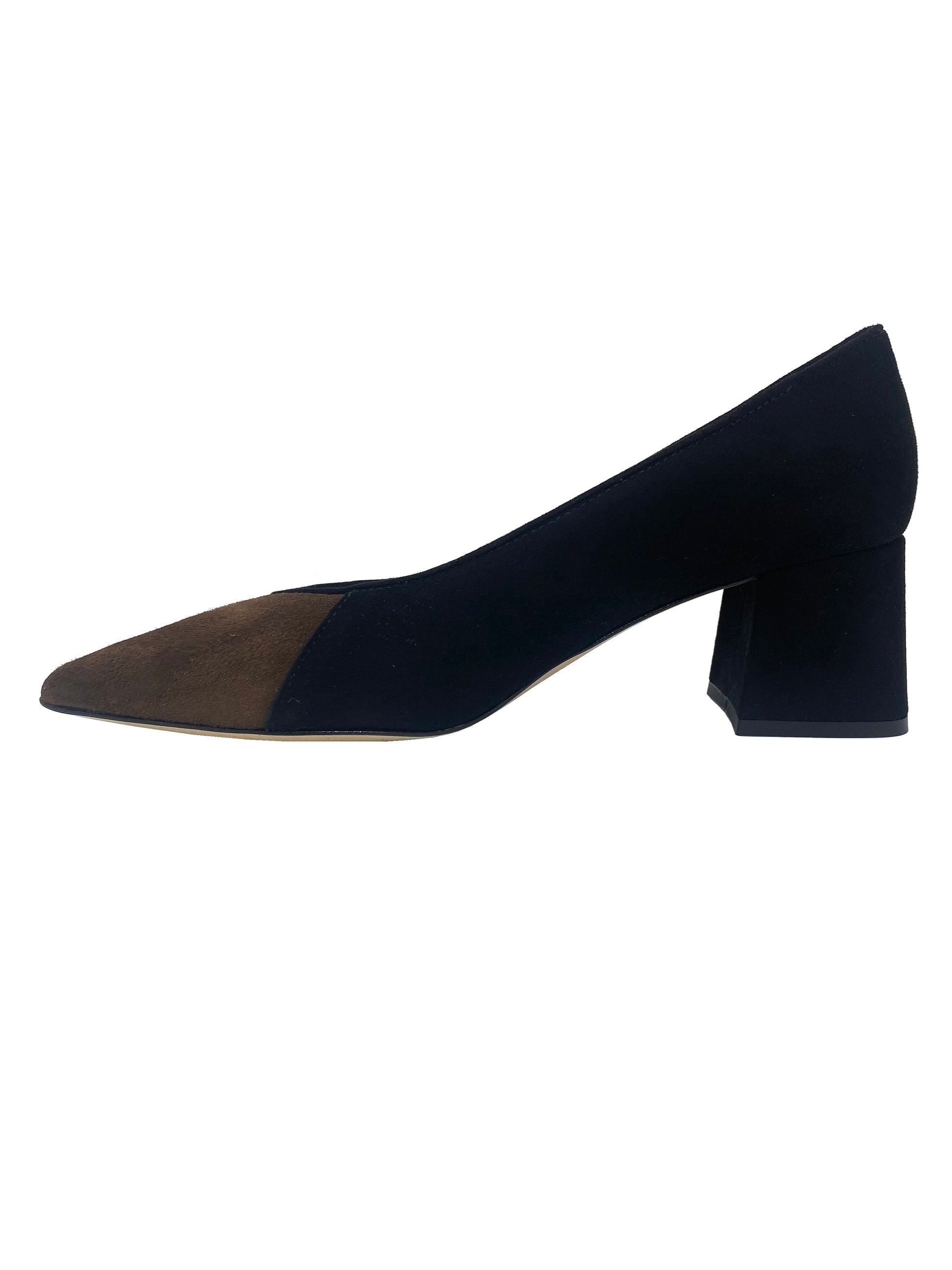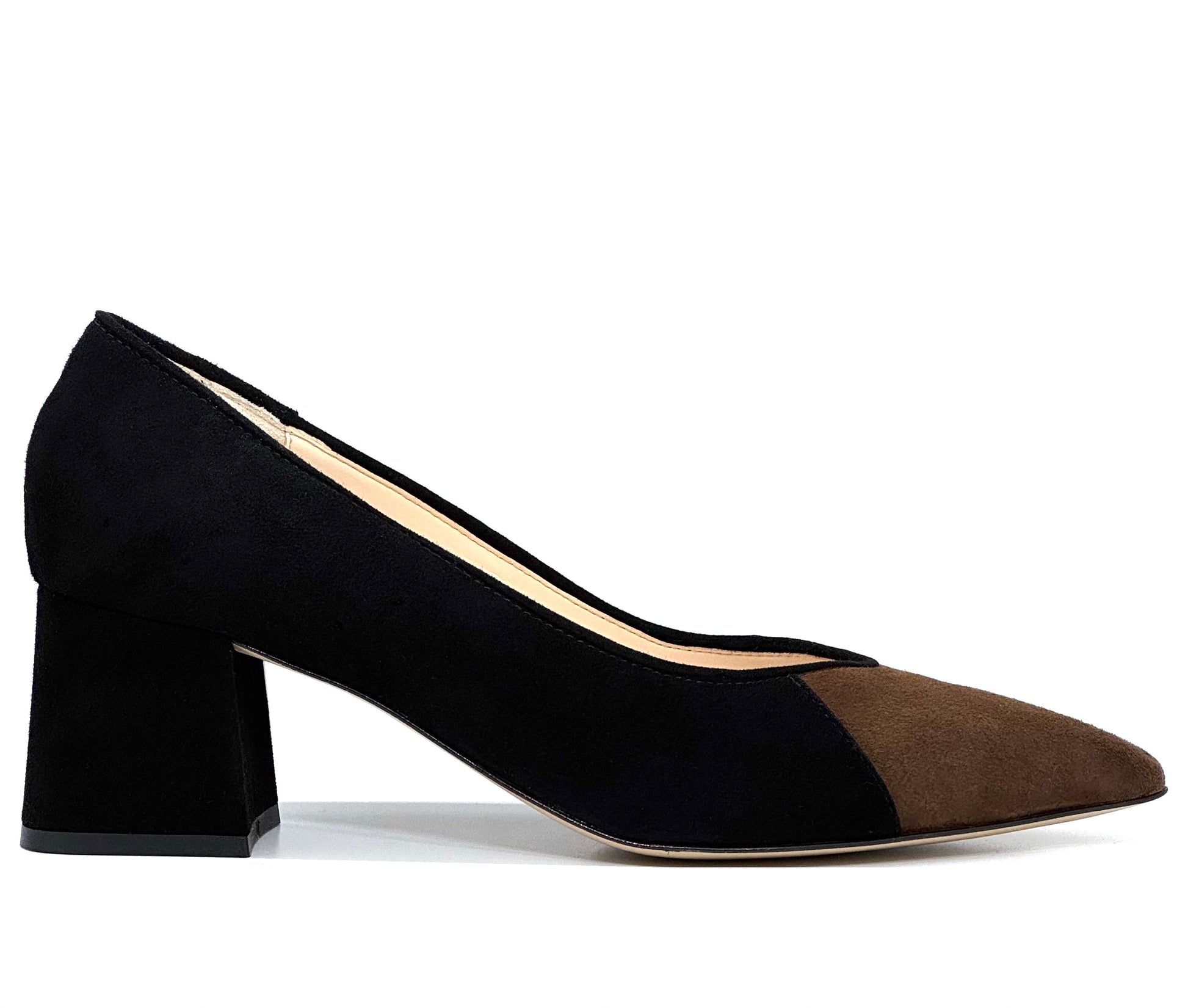 Stylish suede court shoes on a mid height block heel for all day wearability. The pointed toe has a contrasting colour for added interest. Light cushioning under foot for added comfort. Add a touch of elegance and sophistication to any outfit.