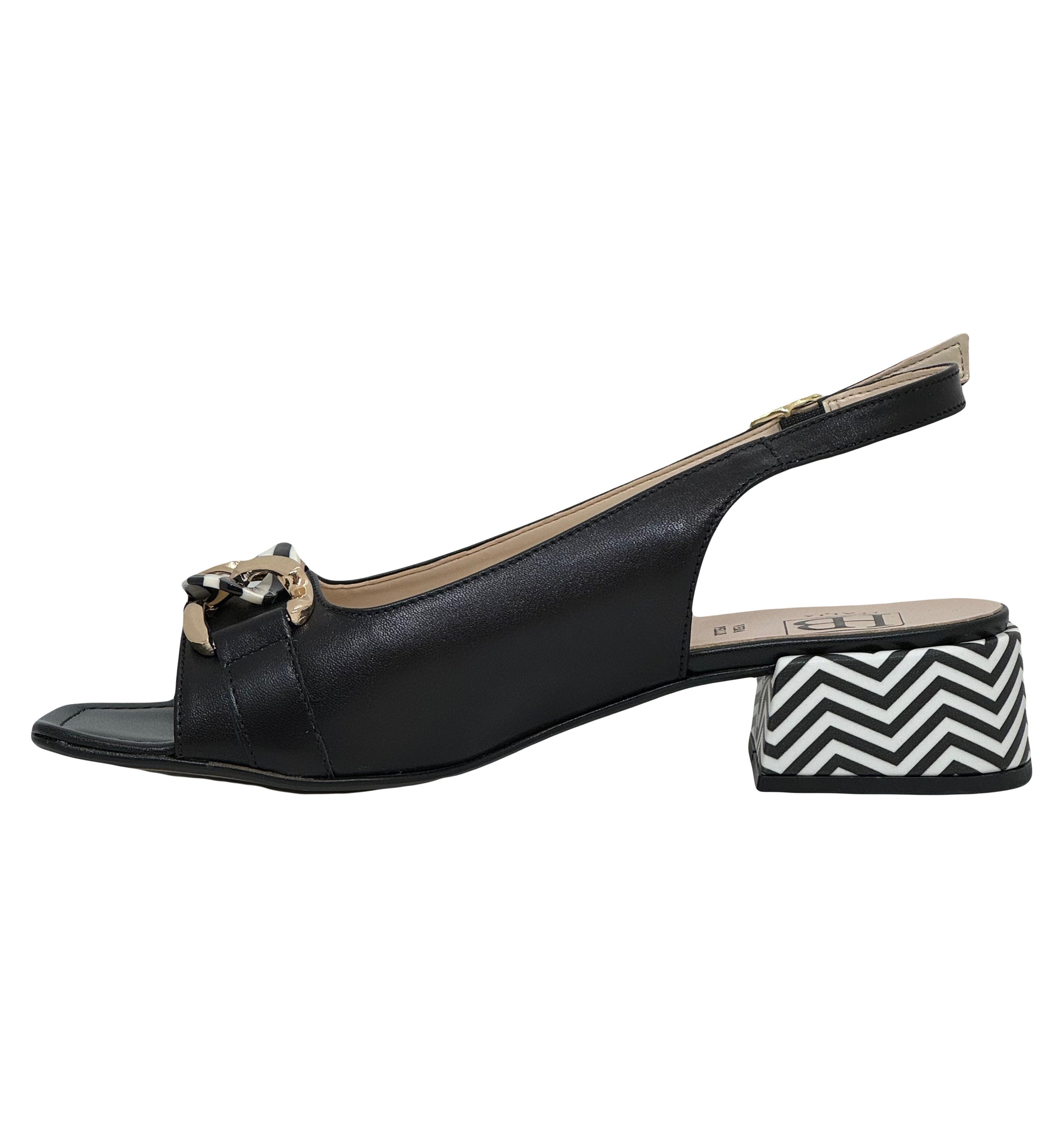 These low heeled sling-back sandals have a squared toe and chunky chain link adornment across the toe. They have an eye-catching zigzag print on the heel. The low block heel and light cushioning under foot provide all day wearability. A versatile sandal that can be dressed up or down. An adjustable buckle fastening to the heel strap allows you to achieve the perfect fit.