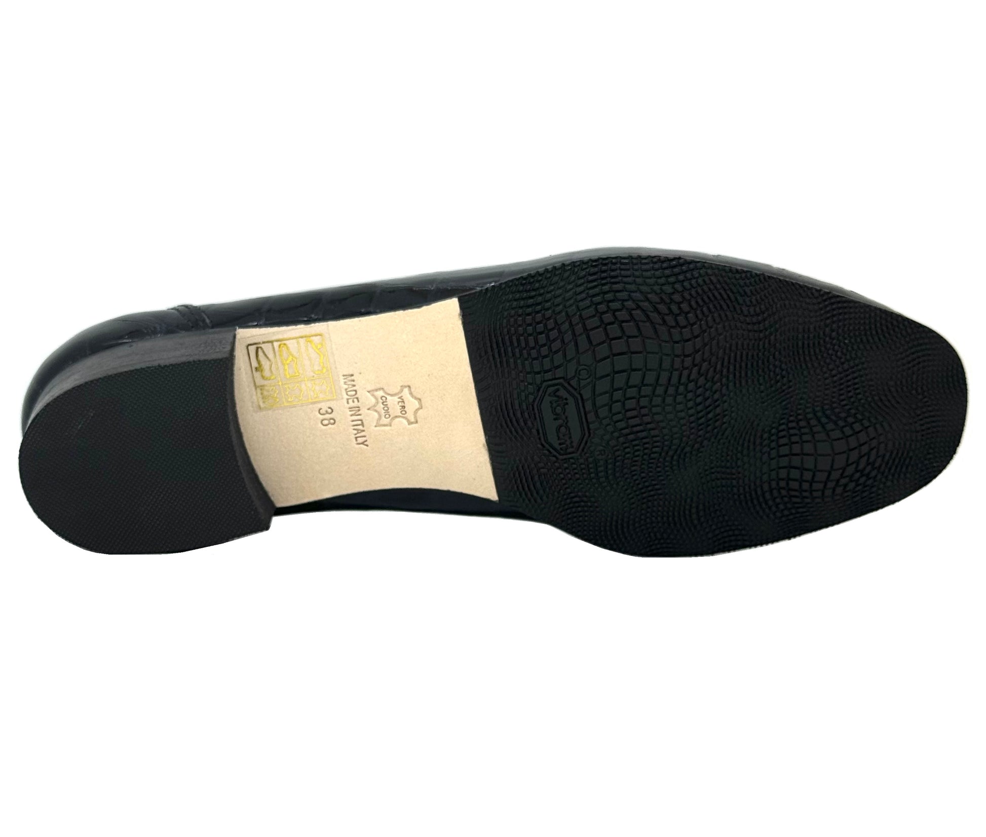 From HB Shoes Italia Range this slip on navy croc effect leather moccasin with suede vamp adorned with a gold trim which offers a timeless classic style.