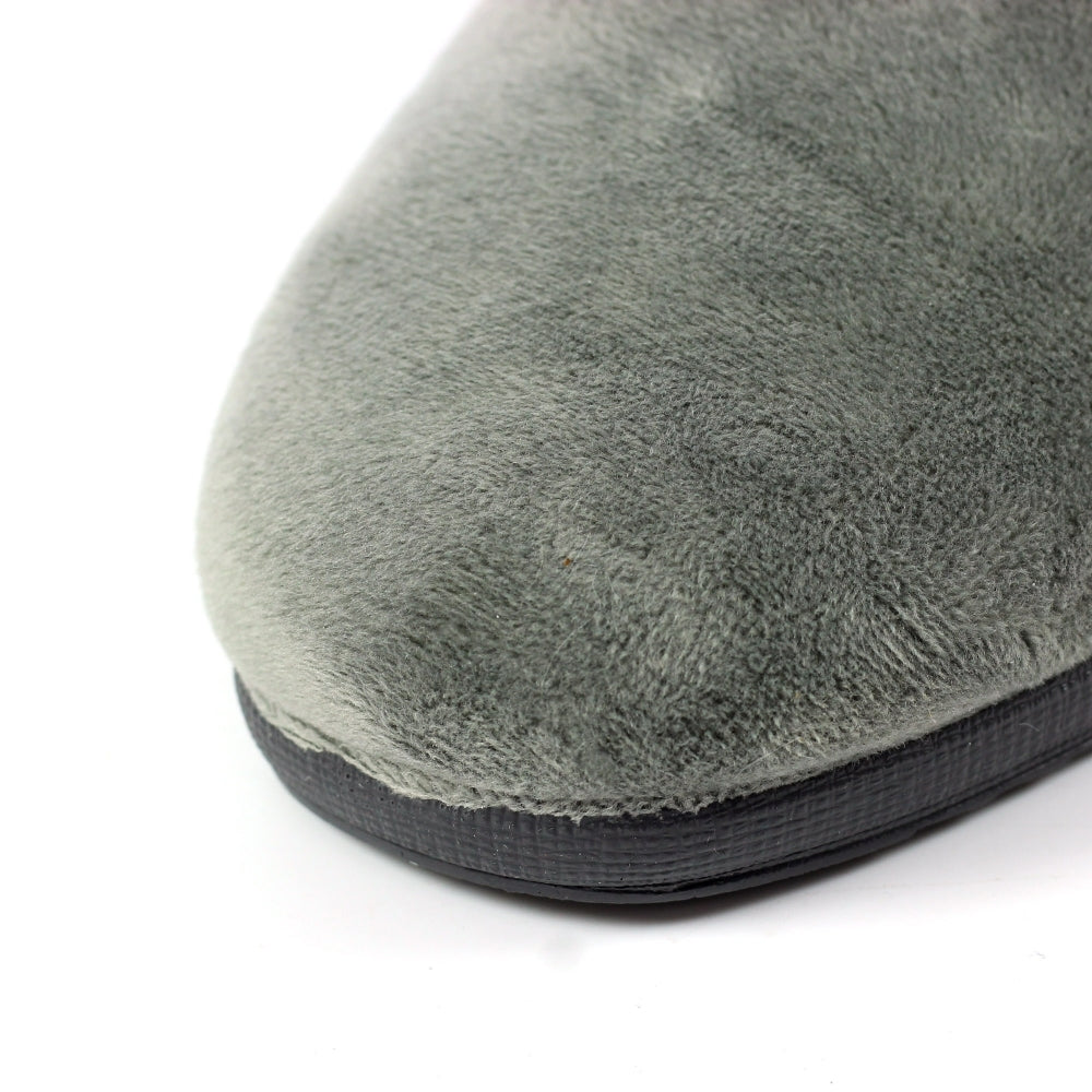 A gorgeous, super soft velour slipper from Lunar. The grey upper is beautifully contrasted by a leopard print trim which gives the slipper a glamorous look. The mid wedge heel, padded footbed and mule design make the slipper comfortable to wear, easy to put on and suitable for all year round wear.