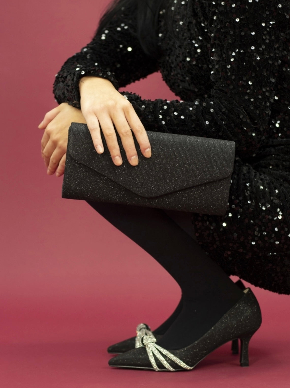 Introducing the Kalina black clutch bag. Crafted from a glitter textile material, its dazzling exterior is guaranteed to catch the light and steal the show. For added convenience, a shoulder chain strap is included, allowing you to go hands-free when needed. Whether it's a night out with friends or a formal event, the Kalina clutch bag is the perfect accessory to make a statement and elevate your ensemble.