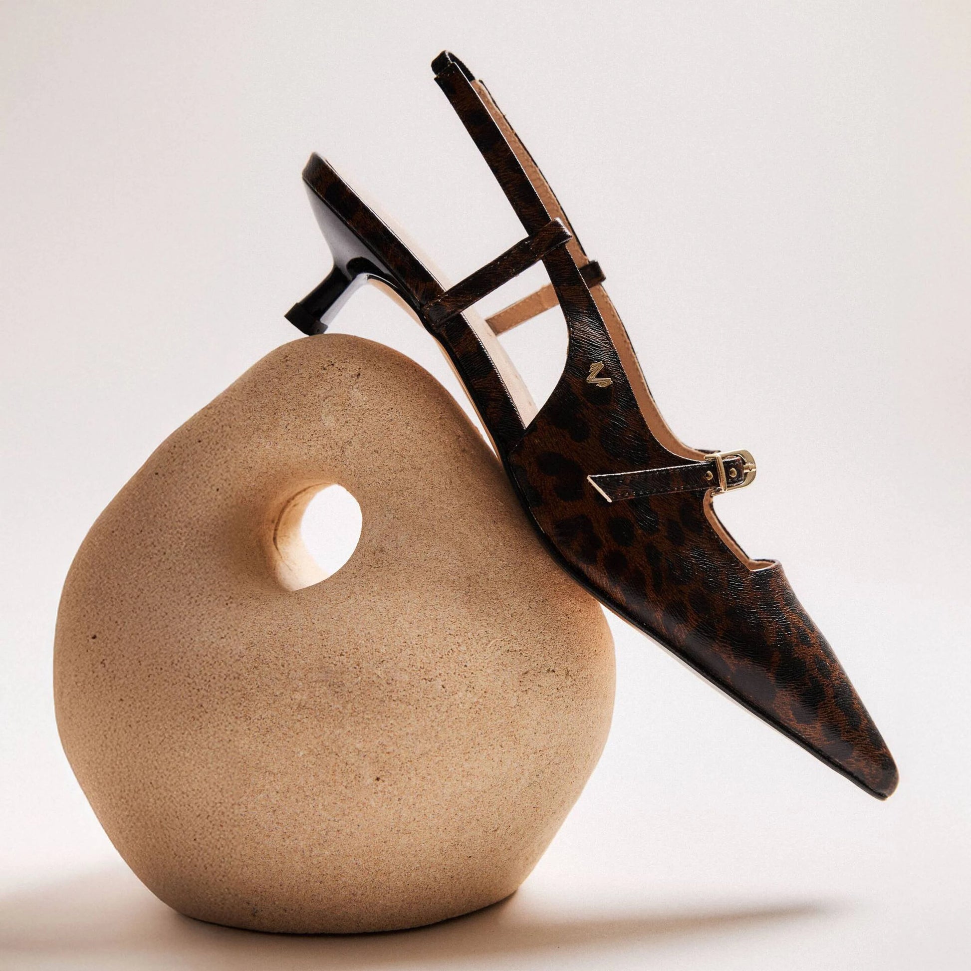 Gaeta slingback court shoe. Slingback patent leather with printed finish, pointed toe, and 4.5 cm stiletto heel. Elevate your everyday with New Elegance, updated sophistication and comfort.