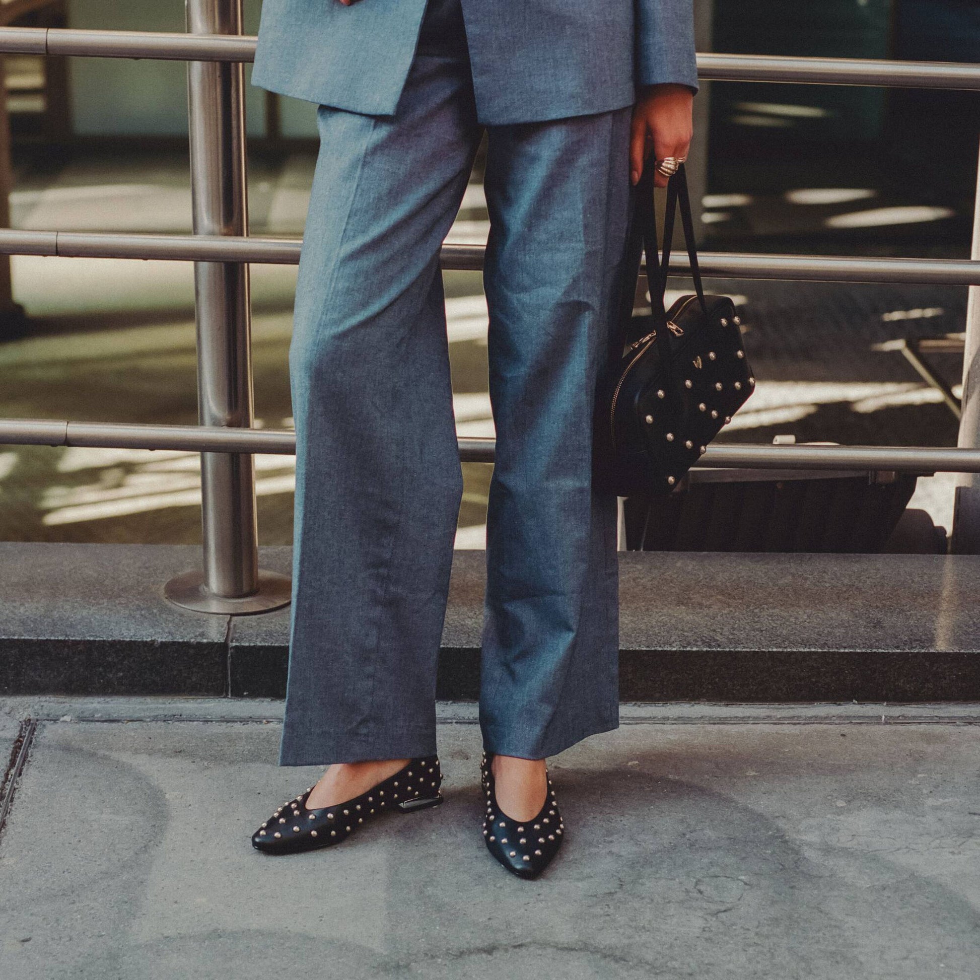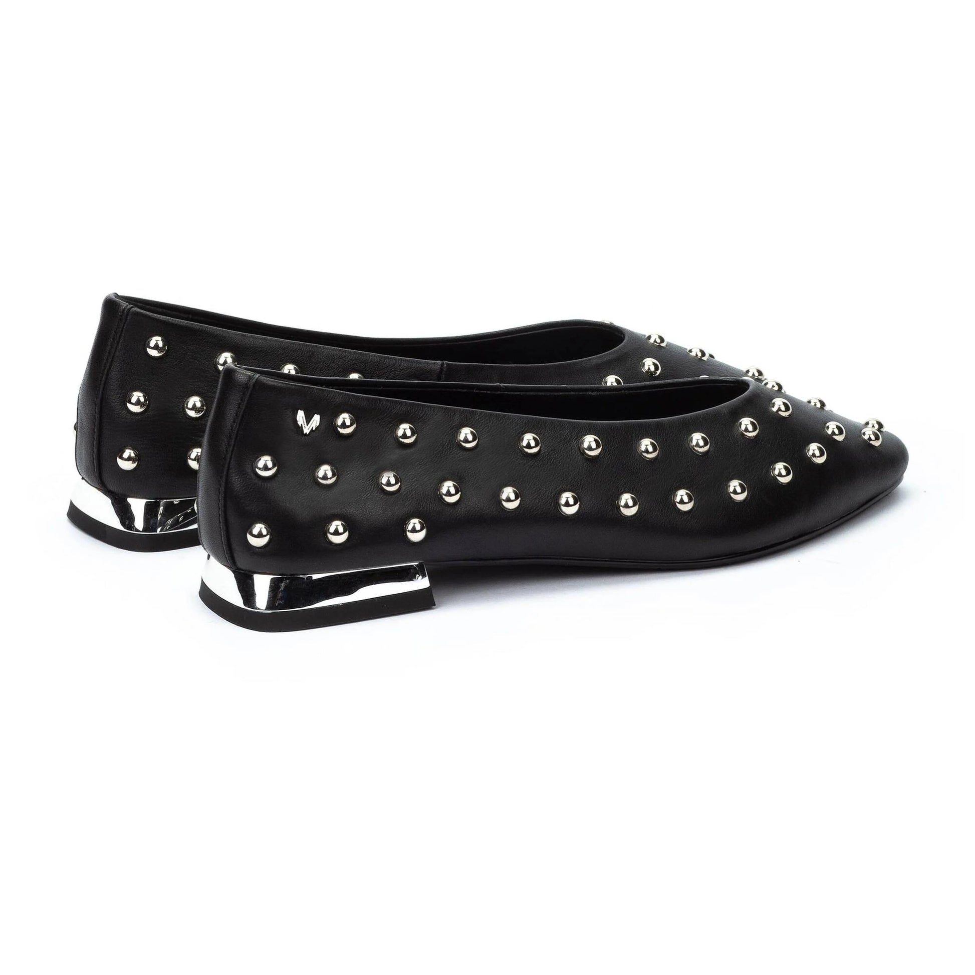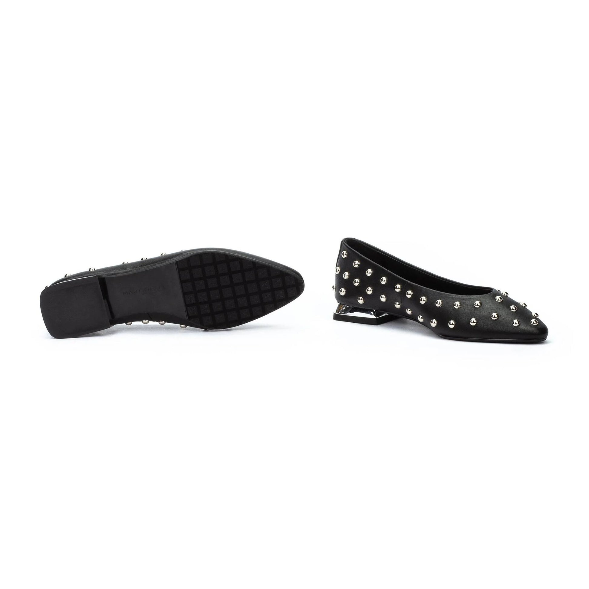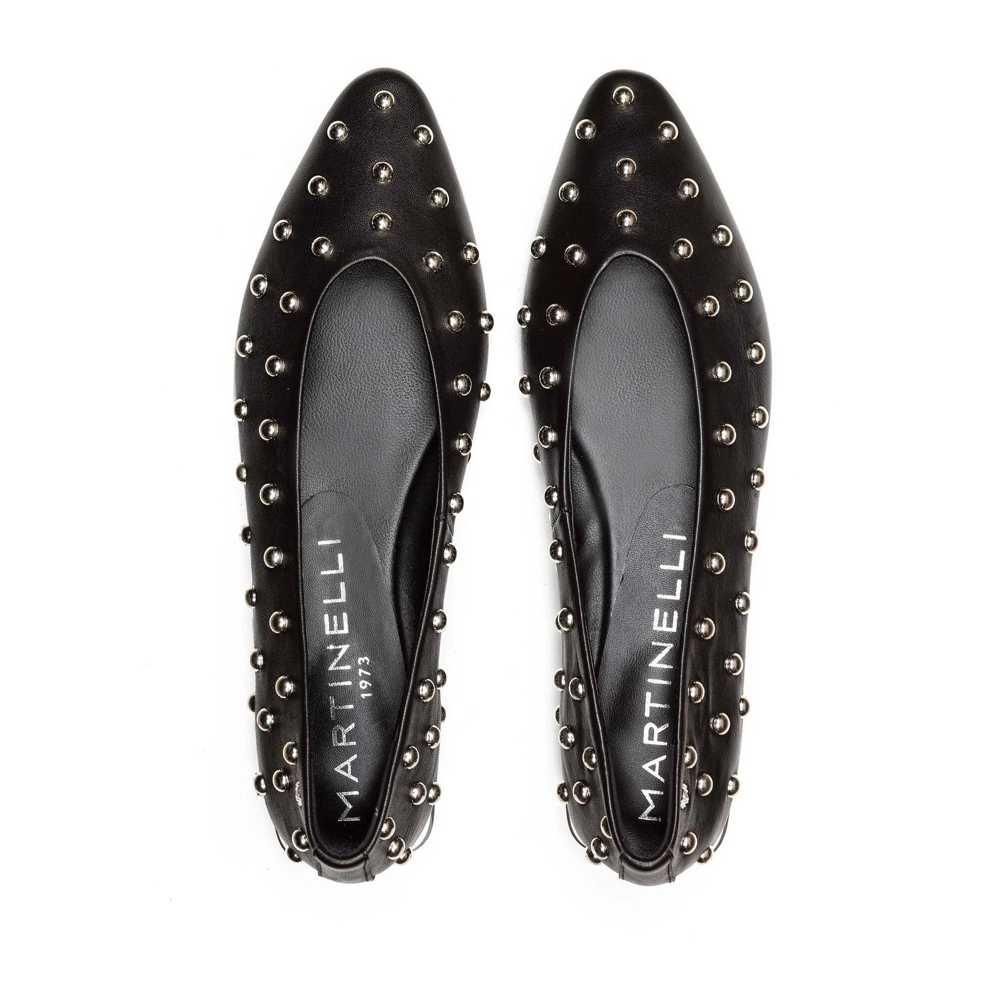 Vescia ballerina. Leather ballerina with studs and a 2.3 cm metallic heel; almond toe. Elevate everyday with New Elegance, updated sophistication and comfort.
