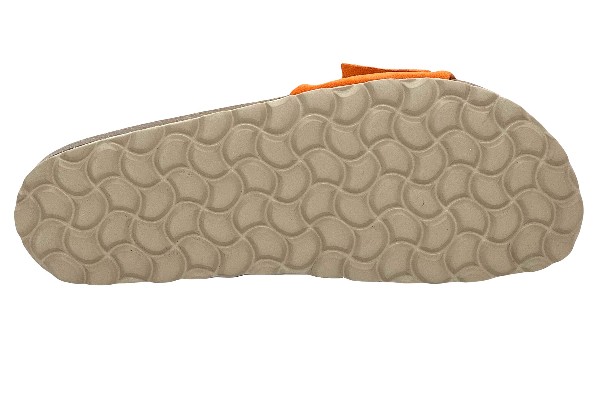 Reiko Velour sandals in orange colour. They are made of velour material. Leather sole and rubber and cork sole.